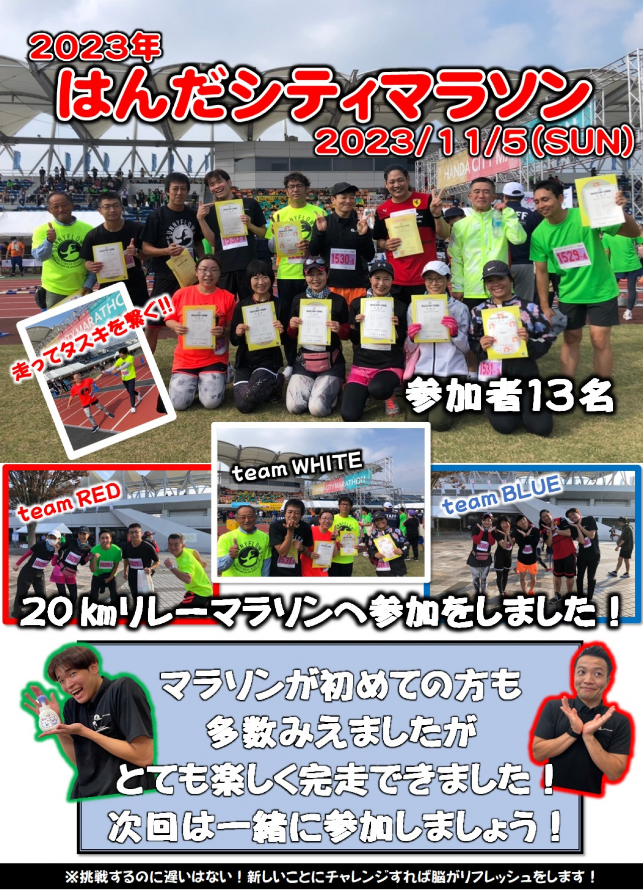 2023年11月5日(日)に半田市運動公園で開催されました「はんだシティマラソン」のリレーマラソンの部門にお客様とスタッフでチームをつくり参加をしました!